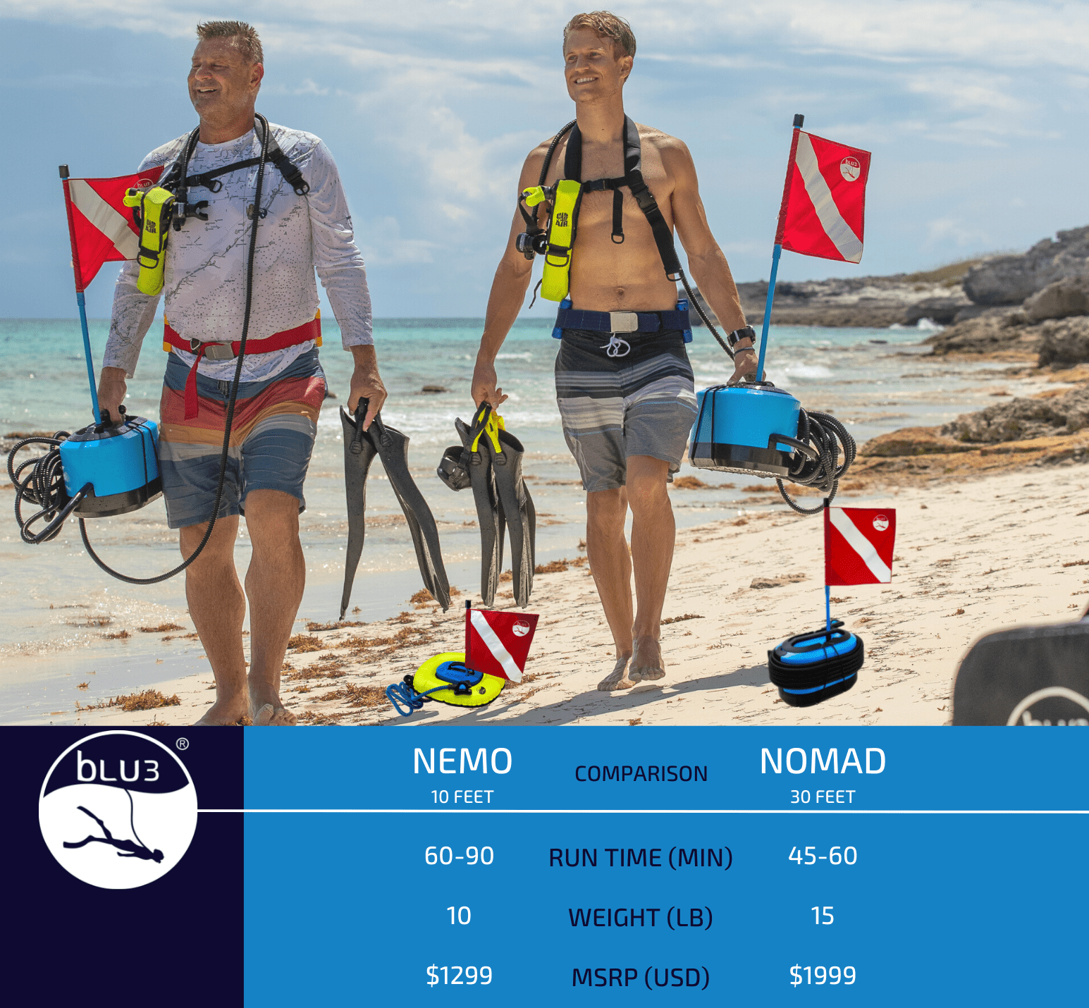Are you looking for a small light weight surface air dive system or are just starting to explore the underwater world? Nemo is the perfect bridge between snorkeling and scuba with a longer battery life that let's you develop the skills you need for underwater adventures. Nemo is ultra-portable which makes it easy to carry and even travel with. It weighs less than 10 pounds and measures less than 12".