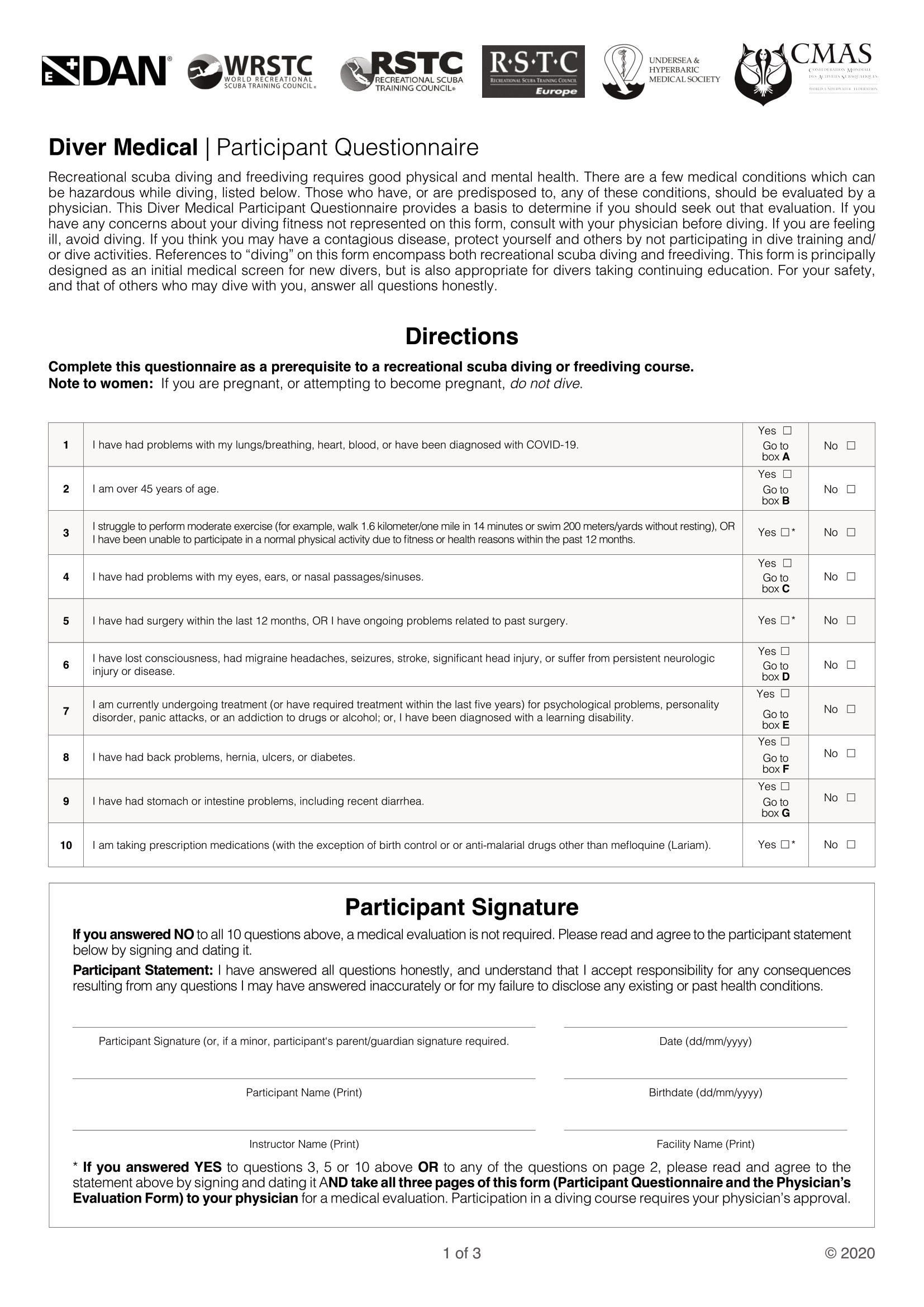 If you answered "YES" to any of the Fitness to Dive Evaluation Questions, you will need to seek approval from a physician prior to diving. Please download BOTH